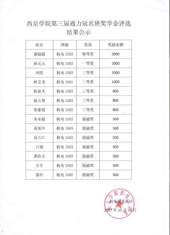 西京学院第三届通力冠名杯奖学金评选结果公示